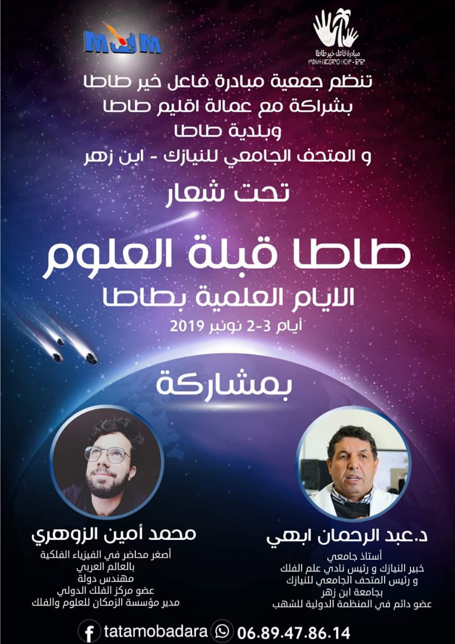 تنظم جمعية مبادرة فاعل خير طاطا أياما علمية تحت شعار ” طاطا قبلة العلوم “، وذلك يومي السبت و الاحد 2 و3 نونبر 2019 بالمركب السوسيو ثقافي، لما وبشراكة مع المتحف الجامعي للنيازك -ابن زهر ، عمالة اقليم طاطا وبلدية طاطا كذلك.