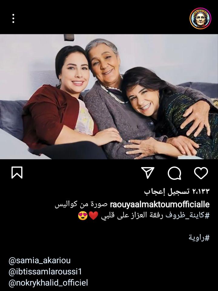 نشرت الفنانة المغربية فاطمة هراندي المعروفة ب “راوية”، على حسابها الشخصي بمواقع تبادل الصور والفيديوهات “انستغرام”، صورة تجمعها بسامية أقريو وفاطمة الزهراء العروسي.