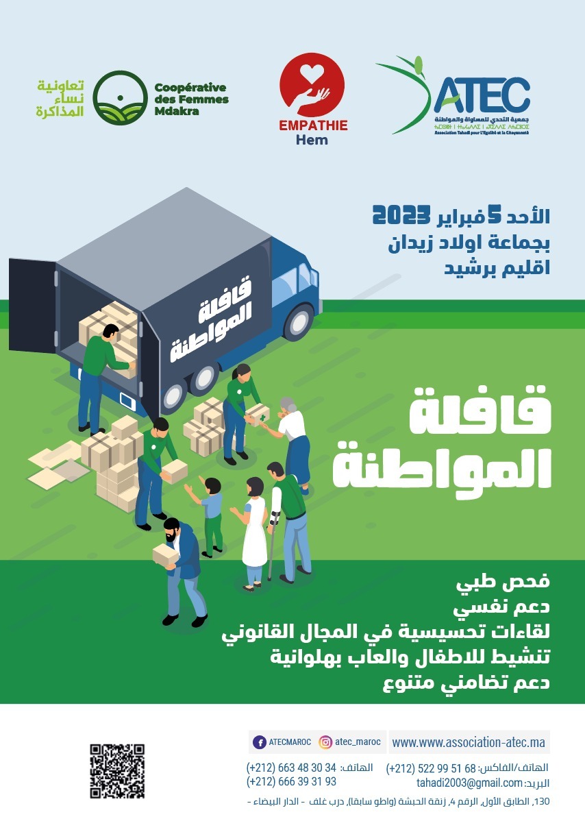 في بادرة إنسانية ذات طابع تضامني، تنظم جمعية التحدي للمساواة والمواطنة ونادي empathie بالمدرسة العليا للتسيير HEM وتعاونية نساء المذاكرة وجماعة أولاد زيدان، “قافلة المواطنة” وذلك يوم الأحد 05 فبراير 2023، بجماعة أولاد زيدان التابعة لإقليم برشيد.