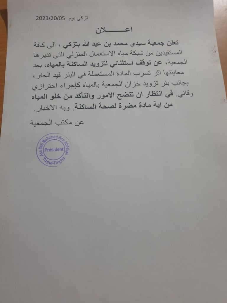 وقد لجأت جمعية سيدي محمد بن عبد الله المسيرة لقطاع الماء بذات الدوار، بعد استمرار الحفر واستعمال مواد كيميائية تجهل الجمعية مفعولها، او مكوناتها، او مدى تأثيرها السلبي على الماء الصالح للشرب، حيث تسربت هذه المواد الى البئر المزودة للساكنة بالماء الصالح للشرب، «لجأت» الى قطع الماء على الساكنة، وأصدرت إعلانا تتوفر جريدة دنا بريس على نسخة منه، تخبر فيه كافة المستفيدين من خدماتها المائية عن قرارها توقفها الاستثنائي عن تزويد الساكنة بالماء الصالح للشرب، بعد تسرب مواد كيميائية مستعملة في البئر قيد الحفر، كاجراء احترازي في انتظار ان تتضح الأمور، على حد تعبير الإعلان.