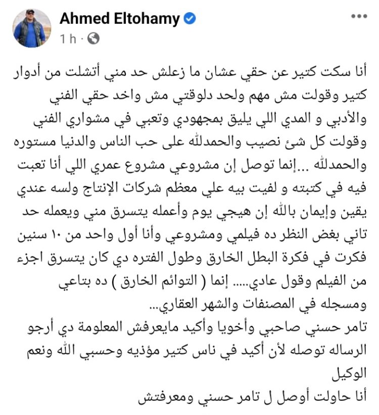 أحمد التهامى يُهاجم صُناع فيلم «تاج» لتامر حسني.. “قصته مسروقة مني ومش هسكت”