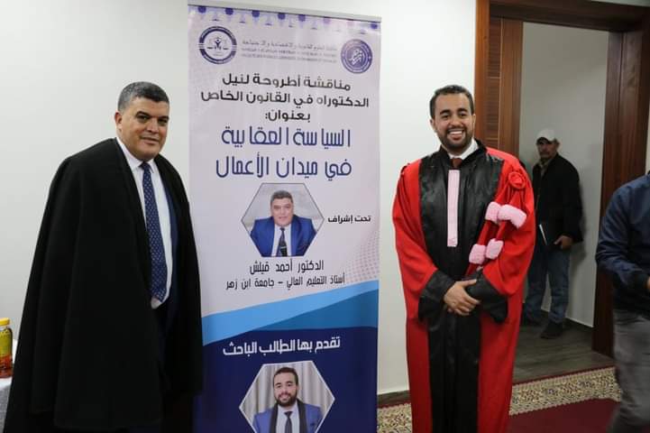 ناقش الدكتور محمد منار أطروحته لنيل شهادة الدكتوراه في القانون الخاص فريق البحث قانون الأعمال والاستثمار، في موضوع: “السياسة العقابية في ميدان الأعمال”، وذلك يوم الجمعة 24 فبراير 2023 برحاب كلية العلوم القانونية والاقتصادية والاجتماعية أكادير .