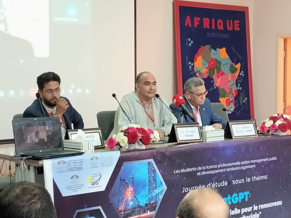 للإشارة فقد نظمت كليتا العلوم القانونية و الإقتصادية والإجتماعية بمراكش وقلعة السراغنة بتعاون مع كلية الإقتصاد والتدبير بكلميم، HEEC مراكش وعدد من المؤسسات الأخرى بـ”مركز التكوين والتأهيل لمهن الصناعة التقليدية” بالمدينة العتيقة بمراكش أول أمس الجمعة 14 أبريل، يوما دراسيا متميزا ناقش فيه الحاضرون موضوع: “شات جي بي تي من الذكاء الإصطناعي لتجديد الذكاء الترابي”. و عرف اليوم الدراسي حضورا مكثفا وخصوصا من الطلبة والدارسين والمهتمين المتخصصين، كما عرف حضور عدد من الأساتذة الخبراء كالدكتور محمد الغالي عميد كلية العلوم القانونية والإقتصادية والإجتماعية بقلعة السراغنة، الدكتور يوسف الوزاني عميد كلية الإقتصاد والتدبير بكلميم، الدكتور مولاي أحمد العمراني رئيس مدرسة الدراسات العليا الإقتصادية والتجارية والهندسية HEEC بمراكش ورئيس منتدى المدارس العليا بالمغرب، الدكتور عبد الله النويب استاذ بكلية الإقتصاد والتدبير بكلميم، الدكتور المدني بنحيون استاذ جامعي، الدكتور رضوان مبارك استاذ جامعي ENCG مراكش، البروفيسور أنس أبوالكلام استاذ جامعي ENSA مراكش، الدكتور عبد الرحيم الغليمي استاذ جامعي ENCG سطات، الدكتورة منال الأندلسي أستاذة جامعية بجامعة شعيب الدكالي والدكتور اسماعيل شعوف رئيس المنطقة الإدارية جامع الفنا ونائب رئيس مقاطعة مراكش المدينة.