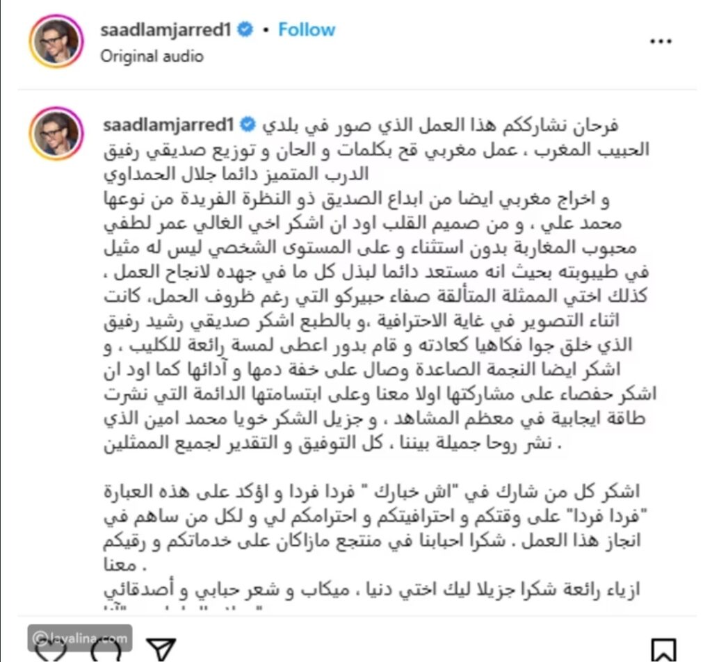 وجه الفنان المغربي سعد لمجرد رسالة شكر لصنّاع أغنيته الجديدة “إيش أخبارك”، من كلمات وتوزيع وألحان جلال الحمداوي.