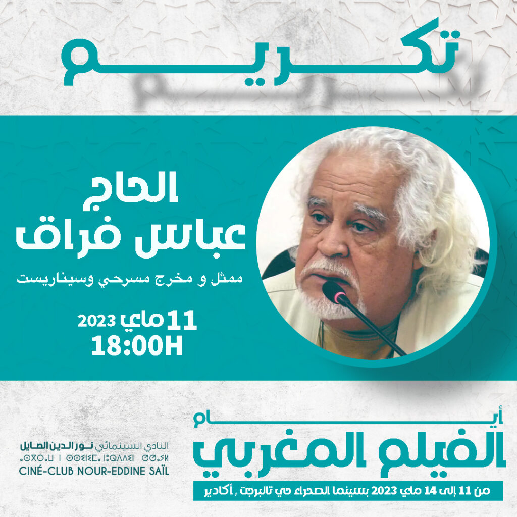 حظي الفنان عباس فراق، في افتتاح الدورة الثانية لأيام الفيلم المغربي مساء الخميس 11 ماي 2023 بقاعة سينما الصحراء بأكادير، بتكريم يليق بمكانته كممثل وسيناريست ومخرج أعطى الشيء الكثير للمسرح والسينما والدراما التلفزيونية ببلادنا، وذلك من طرف النادي السينمائي نور الدين الصايل، الجهة المنظمة لهذه التظاهرة الفنية. وقد تميز حفل هذا التكريم، الذي حضره ممثلو الجماعة الترابية لعاصمة سوس وثلة من الفنانين والمثقفين والجمعويين وغيرهم، بكلمات وشهادات بالمناسبة وتقديم هدايا رمزية من بينها بورتريه من إنجاز الفنان محمد أوسحاق. فيما يلي ورقة تعريفية مركزة بالمحتفى به أعدها الأستاذ أحمد سيجلماسي: