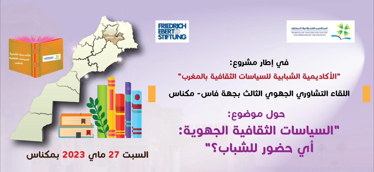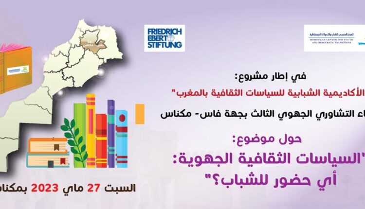ينظم المركز المغربي للشباب والتحولات الديمقراطية بشراكة مع مؤسسة فريدريش إيبرت اللقاء التشاوري الجهوي الثالث بجهة فاس – مكناس حول موضوع “السياسات الثقافية الجهوية: أي حضور للشباب؟”، وذلك يوم السبت 27 ماي 2023 بمدينة مكناس.