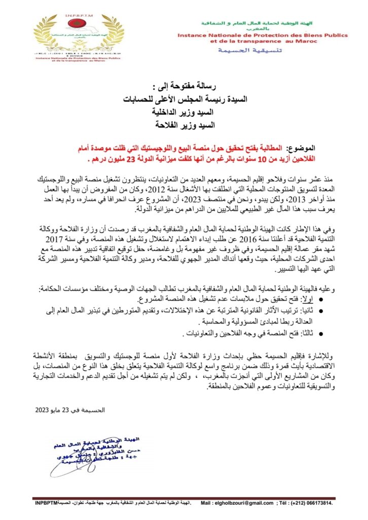 وقالت الهيئة الوطنية لحماية المال العام والشفافية بالمغرب، في رسالتها، انها رصدت قيام وزارة الفلاحة/وكالة التنمية الفلاحية سنة 2016 بالإعلان عن طلب إبداء الإهتمام لاستغلال وتشغيل هذه المنصة، وفي سنة 2017 شهد مقر عمالة اقليم الحسيمة حفل توقيع اتفافية تدبير هذه المنصة مع احدى الشركات المحلية، حيث وقعها أنذاك المدير الجهوي للفلاحة، مدير وكالة التنمية الفلاحية ومسير الشركة التي عهد اليها التسيير تحت إشراف وزير الفلاحة ٱنذاك عزيز أخنوش.