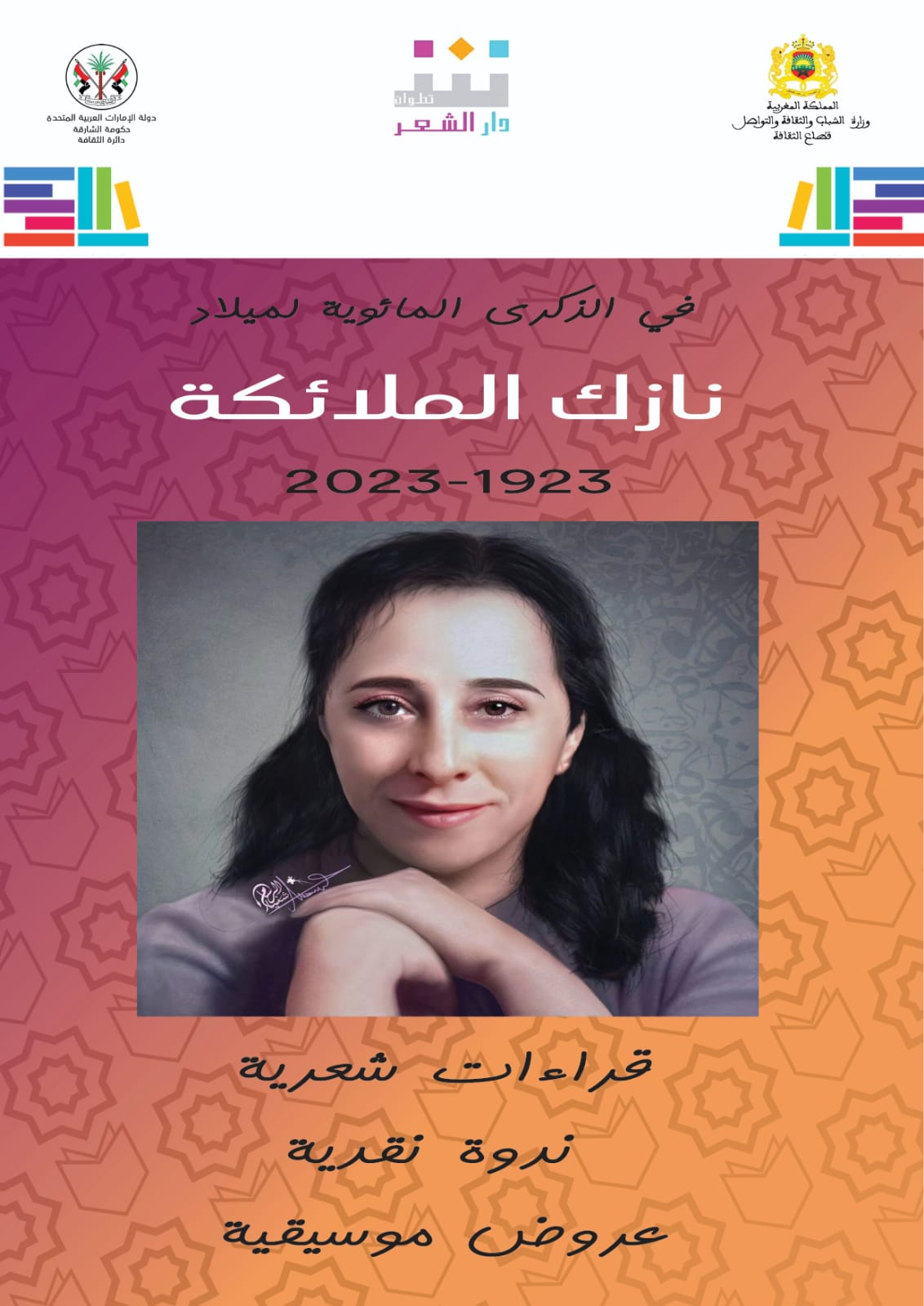 كما تعقد دار الشعر بتطوان ندوة نقدية عربية حول “تجديد النظر إلى الشعر العربي”، احتفاء بالذكرى المائوية لميلاد نازك الملائكة، يوم السبت 10 يونيو الجاري، بقاعة الأوداية، في فضاء المعرض، ابتداء من الثالثة زوالا، بمشاركة حاتم الصكر وعارف الساعدي من العراق، وحسين حمودة من مصر، وصبحي حديدي من سوريا، وصلاح بوسريف من المغرب.