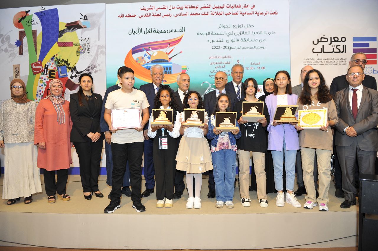 نظمت وكالة بيت مال القدس الشريف، اليوم الجمعة (9 يونيو 2023) في رحاب المعرض الدولي للنشر والكتاب، حفل توزيع الجوائز على الفائزين في الدورة الرابعة من مسابقة “ألوان القدس” للموسم الدراسي 2022 – 2023، وذلك بحضور وزير التربية الوطنية والتعليم الأولي والرياضة بالمملكة المغربية السيد شكيب بنموسى، وسفير دولة فلسطين لدى المغرب السيد جمال الشوبكي، وشخصيات دبلوماسية وثقافية واجتماعية.