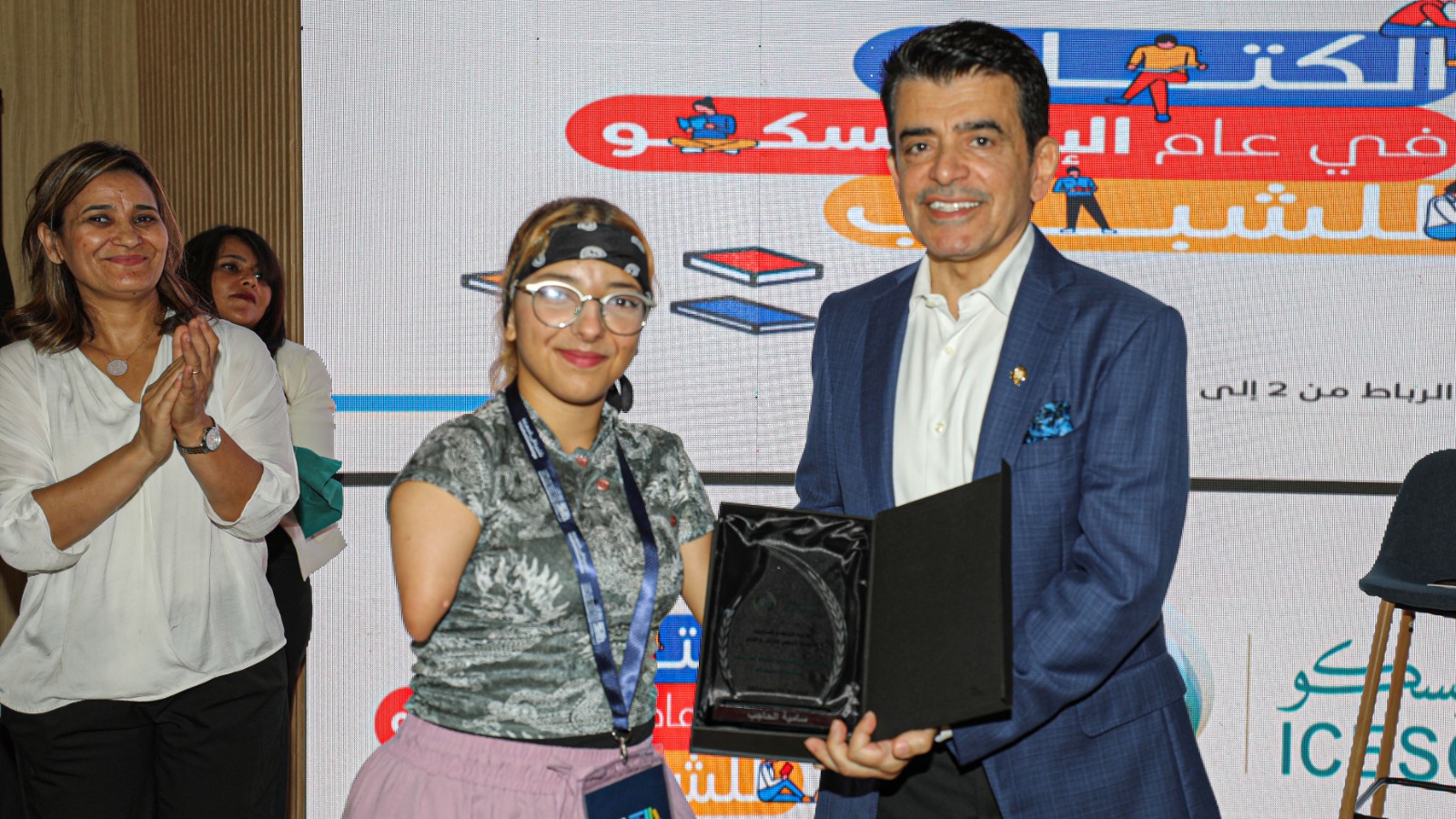 وعقب ذلك سلم المدير العام للإيسيسكو درعا تكريمية للشابة سامية حاجب تقديرا لجهودها والنجاحات التي حققتها، بالإضافة إلى شهادات تقديرية للأطفال ذوي الهمم من مؤسسة للا أسماء للأطفال والشباب الصم، ووجه الشكر إلى المؤسسة وآباء الأطفال الذين يساندونهم، مؤكدا أن استضافة هؤلاء الأطفال من أفضل اللحظات التي شهدها جناح الإيسيسكو في معرض الرباط للكتاب.