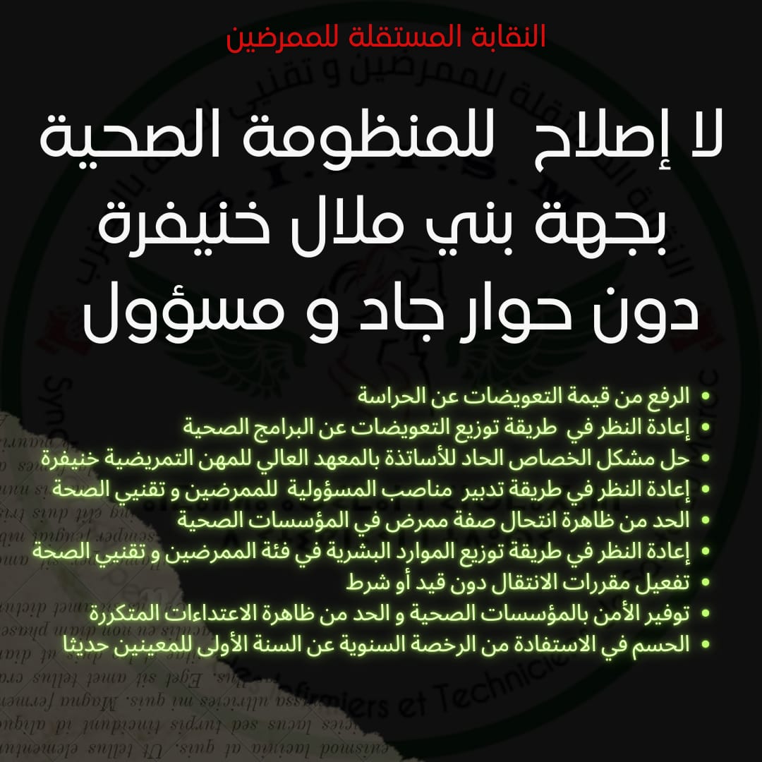 باعتبارها نقابة مستقلة للممرضين وبناء على الالتزام الذي يجمعها بعموم الممرضين وتقنيي الصحة بالجهة واستحضارا للمسؤولية التاريخية والاجتماعية الملقاة على عاتقها، نؤكد استعدادها لمواجهة كل من سولت له نفسه استهداف مناضلي ومنخرطي النقابة المستقلة والتضييق عليهم من خلال المساس بحقهم الدستوري في العمل النقابي.