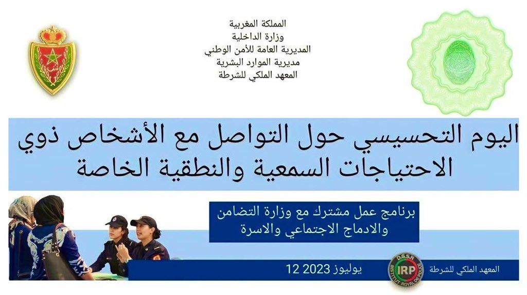 ويندرج تنظيم هذا اليوم التحسيسي في إطار الشراكة التي تجمع بين المديرية العامة للأمن الوطني ووزارة التضامن والإدماج الاجتماعي والأسرة، وهي الشراكة التي تروم تكوين موظفات وموظفي الشرطة حول التقنيات الأساسية للتواصل باستعمال لغة الإشارة مع الأشخاص ذوي الاحتياجات السمعية والنطقية، فضلا عن وضع إطار عام لإدماج هذه اللغة الخاصة ضمن برامج التكوين الشرطي الأساسي والمستمر.