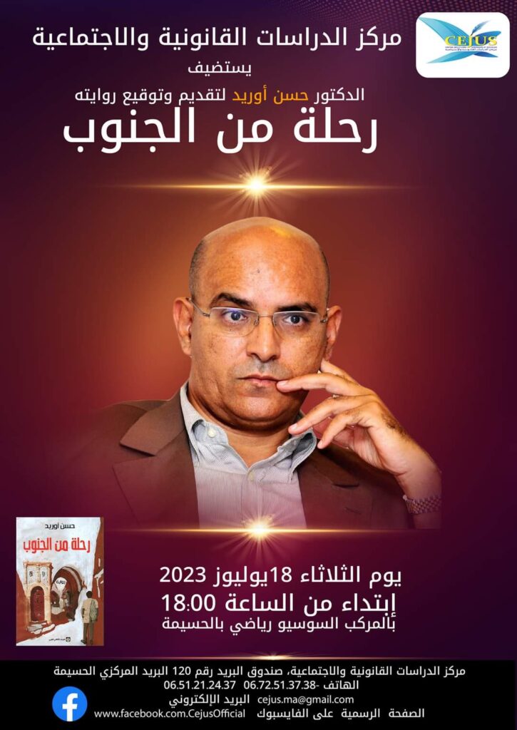 من المرتقب أن يستضيف مركز الدراسات القانونية والاجتماعية يوم الثلاثاء 18 يوليوز 2023، بالمركب السوسيورياضي بالحسيمة، الدكتور حسن أوريد لتقديم وتوقيع رواية “رحلة من الجنوب” التي صدرت اخيرا في 240 صفحة عن المركز العربي الثقافي وذلك في إطار سلسلة من اللقاءات الفكرية والثقافية التي دشنها المركز منذ سنوات، وتنزيلا لبرنامجه الإشعاعي والأكاديمي