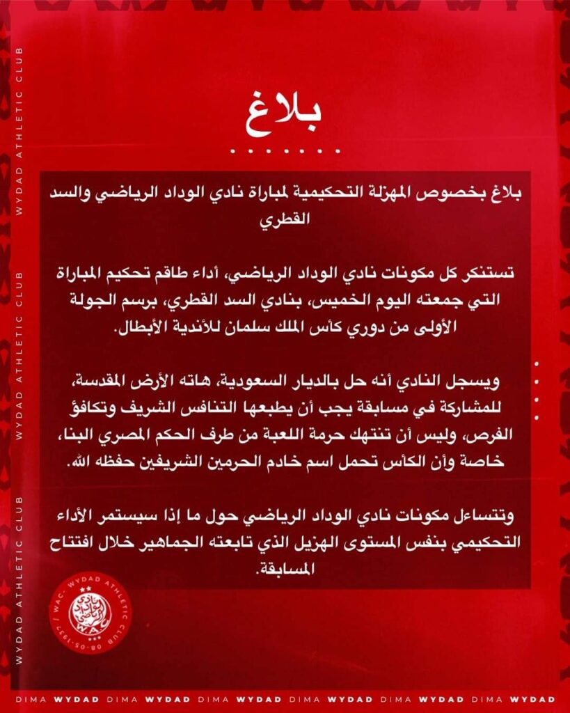 ويشير البلاغ، الى ان الوداد الرياضي تعرض لمهزلة تحكيمية في مواجهته الاولى ضد السد القطري ، بطلها الحكم المصري “البنا” الذي قاد المباراة وانتهك فيها حرمة اللعب ومبدأ تكافؤ الفرص .
