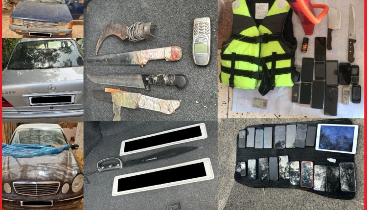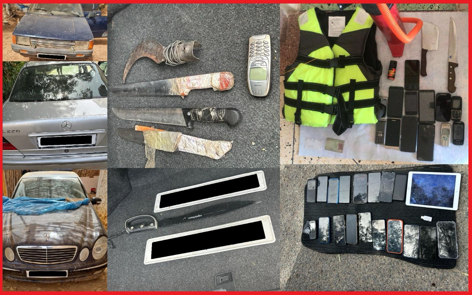 عمليات التفتيش المنجزة في إطار هذه القضية مكنت من حجز معدات للملاحة البحرية، وأربع سيارات ومجموعة من صفائح التسجيل المزورة وأسلحة بيضاء، علاوة على حجز مجموعة من الهواتف النقالة ومتعلقات شخصية ومبالغ مالية يشتبه في كونها من عائدات هذا النشاط الإجرامي.