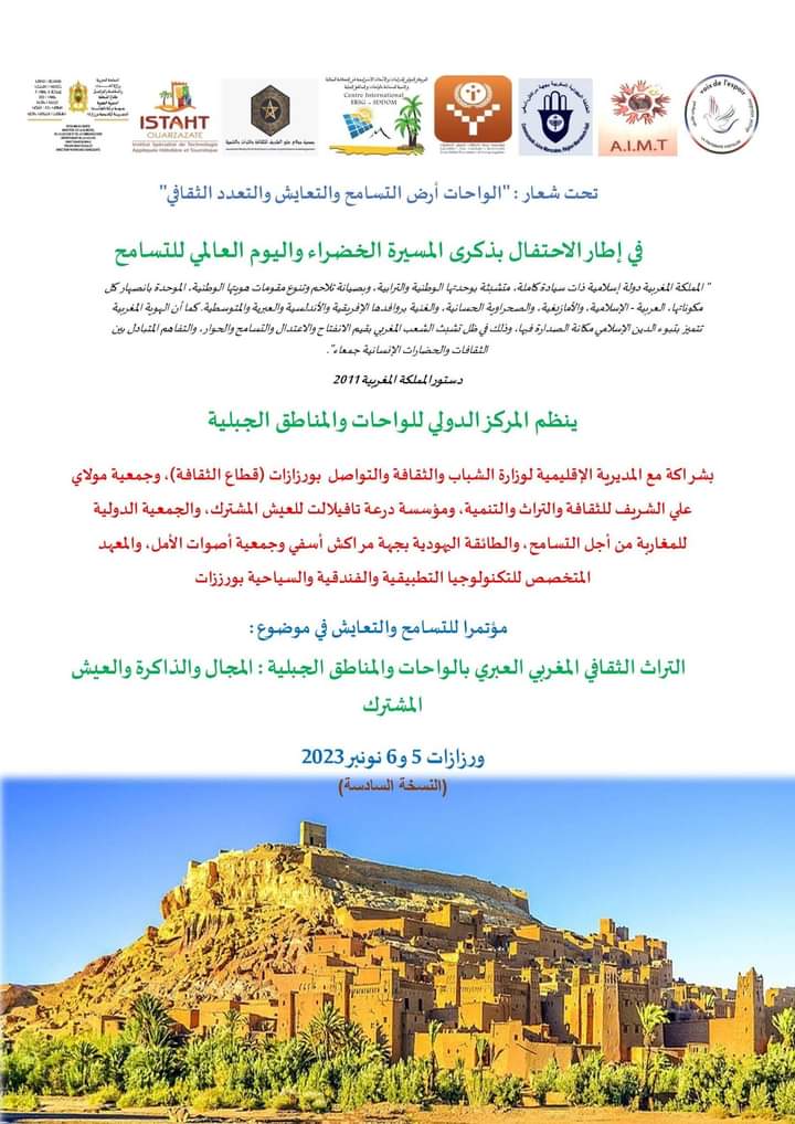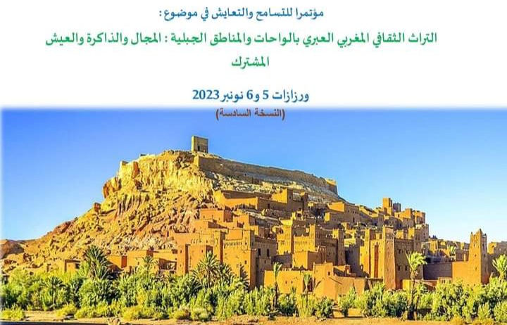 ينظم المركز الدولي للواحات والمناطق الجبلية مؤتمر التسامح والتعايش، تحت شعار ” التراث الثقافي المغربي العبري بالواحات والمناطق الجبلية: المجال والذاكرة والعيش المشترك”، بمدينة ورزازت يومي 5و6 نونبر 2023، وذلك في اطار اهتماماته الكبرى بالمجال الواحي، والموروث الثقافي للواحة، و بمناسبة ذكرى المسيرة الخضراء واليوم العالمي للتسامح.