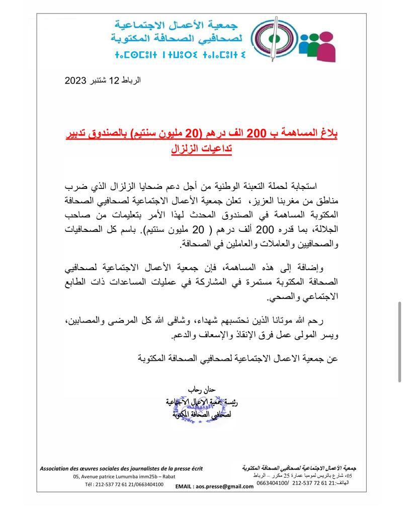 ،واضاف البلاغ على أن جمعية الأعمال الاجتماعية لصحافيي الصحافة المكتوبة، بالإضافة إلى مساهمتها في الصندوق المحدث لدعم ضحايا الفاجعة، أنها ستستمر في المشاركة في عمليات المساعدات ذات الطابع الاجتماعي والصحي.