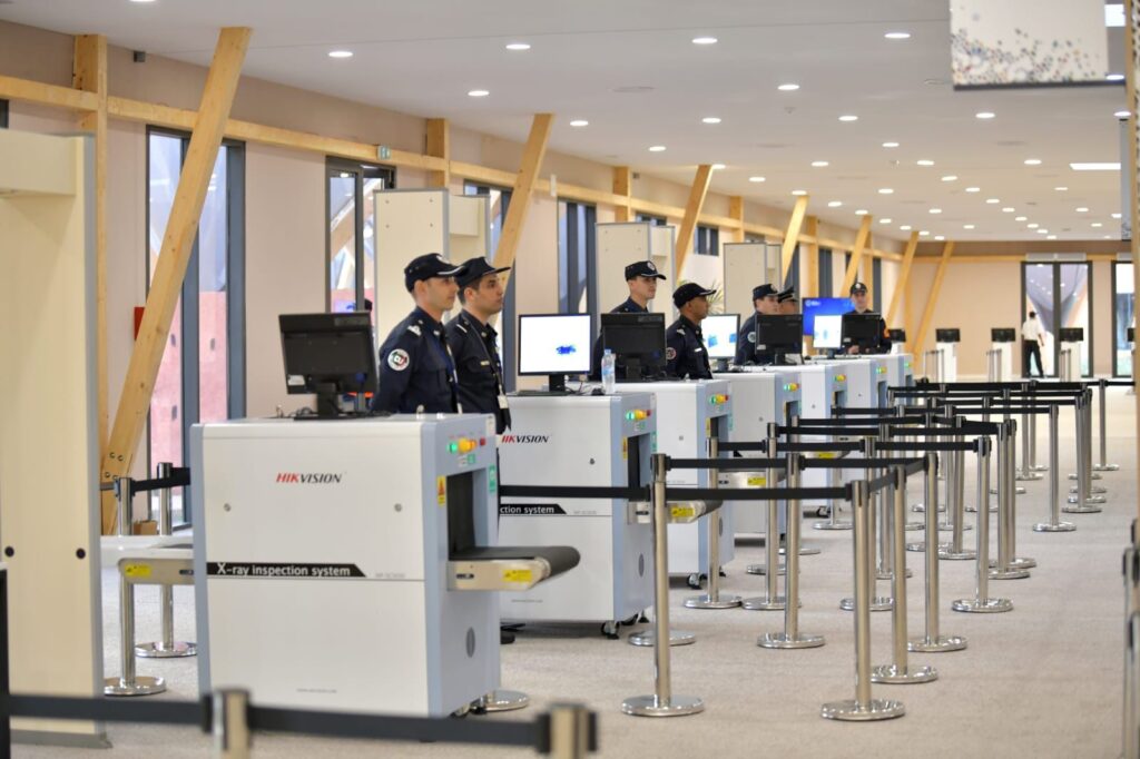 وعلى مستوى بوابات القرية، تم تنصيب مستوى ثاني من المراقبة الأمنية، من خلال اعتماء أجهزة للمسح الضوئي والتفتيش باستعمال تقنيات جد متطورة، قادرة على كشف كافة أنواع التهديدات ومصادر الخطر، فضلا عن توفير بوابات إلكترونية ذكية وعناصر بشرية عالية الخبرة في التفتيش الدقيق. مدعومة بفرق من الشرطة السينوتقنية تتوفر على مجموعة من الكلاب المدربة على كشف جميع أنواع المتفجرات والمواد الكيماوية الخطيرة.