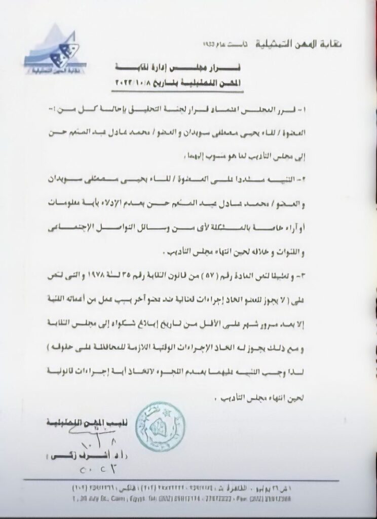وإختتم البيان: “تنفيذاً لنص المادة رقم (57) من قانون النقابة رقم 35 لسنة 1978 والتي نصت على (لا يجوز للعضو إتخاذ الإجراءات القضائية على عضو آخر بسبب أحد أعماله الفنية إلا بعد أن يقل عن ذلك) وقد مضى شهر على تاريخ تقديم شكواه إلى مجلس النقابة وله إتخاذ الإجراءات المؤقتة اللازمة لحفظ حقوقه ، لذا وجب تنبيههم بعدم اللجوء إلى اتخاذ أي إجراءات قانونية حتى إنتهاء مجلس التأديب. “.