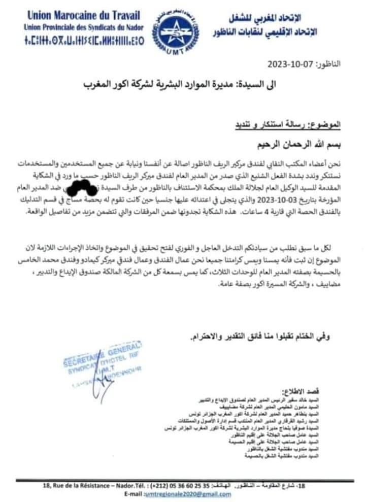 في رسالة موجهة إلى مديرة الموارد البشرية لشركة أكور، المالكة لفندق الريف بالناظور، طالب المكتب النقابي لفندق ميركور الريف المنضوي تحت لواء الإتحاد المغربي للشغل، بفتح تحقيق لكشف ملابسات واقعة تحرش جنسي تعرضت لها إحدى المستخدمات بالفندق.