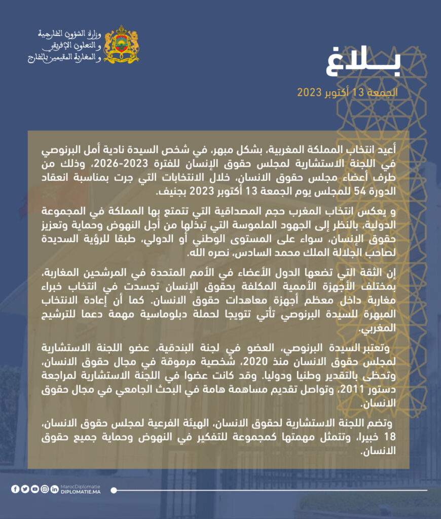 جنيف، في إنجاز مذهل يؤكد مكانة المملكة المغربية على الساحة الدولية، تمت إعادة انتخاب السيدة نادية أمل البرنوصي لتمثيل المملكة في اللجنة الاستشارية لمجلس حقوق الإنسان بالأمم المتحدة للفترة 2023-2026. وذلك خلال انتخابات الدورة 54 للمجلس والتي جرت في جنيف اليوم الجمعة، الموافق ل13 أكتوبر 2023.