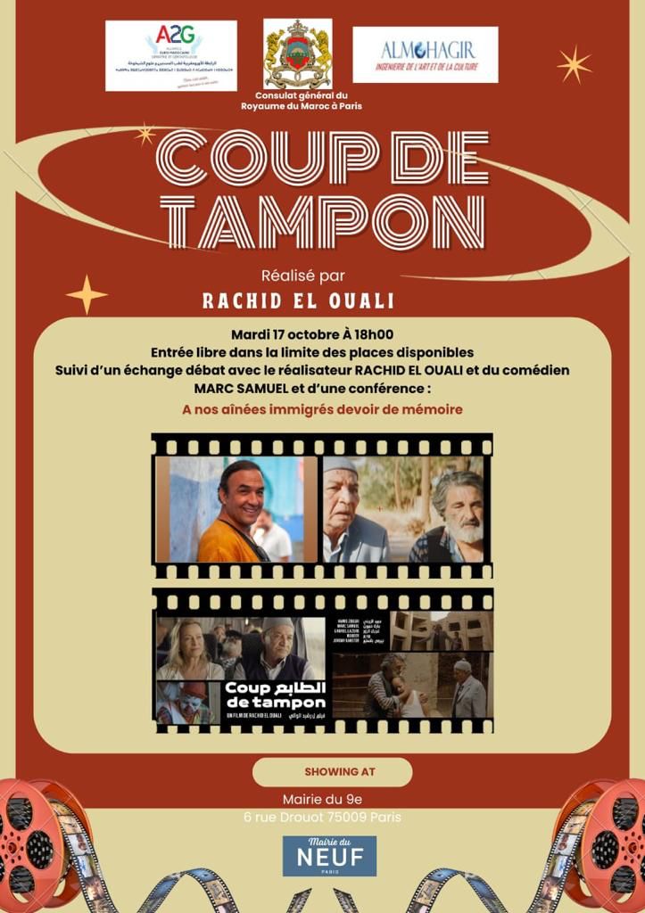 تستضيف جمعية المهاجر، وجمعية الرابطة الأورو-مغربية لطب المسنين، تحت إشراف السيدة ندى بقالي، القنصل العام للمملكة المغربية بباريس، الحدث السينمائي” Coup de Tampon”، “الطابع” لمخرجه رشيد الوالي.