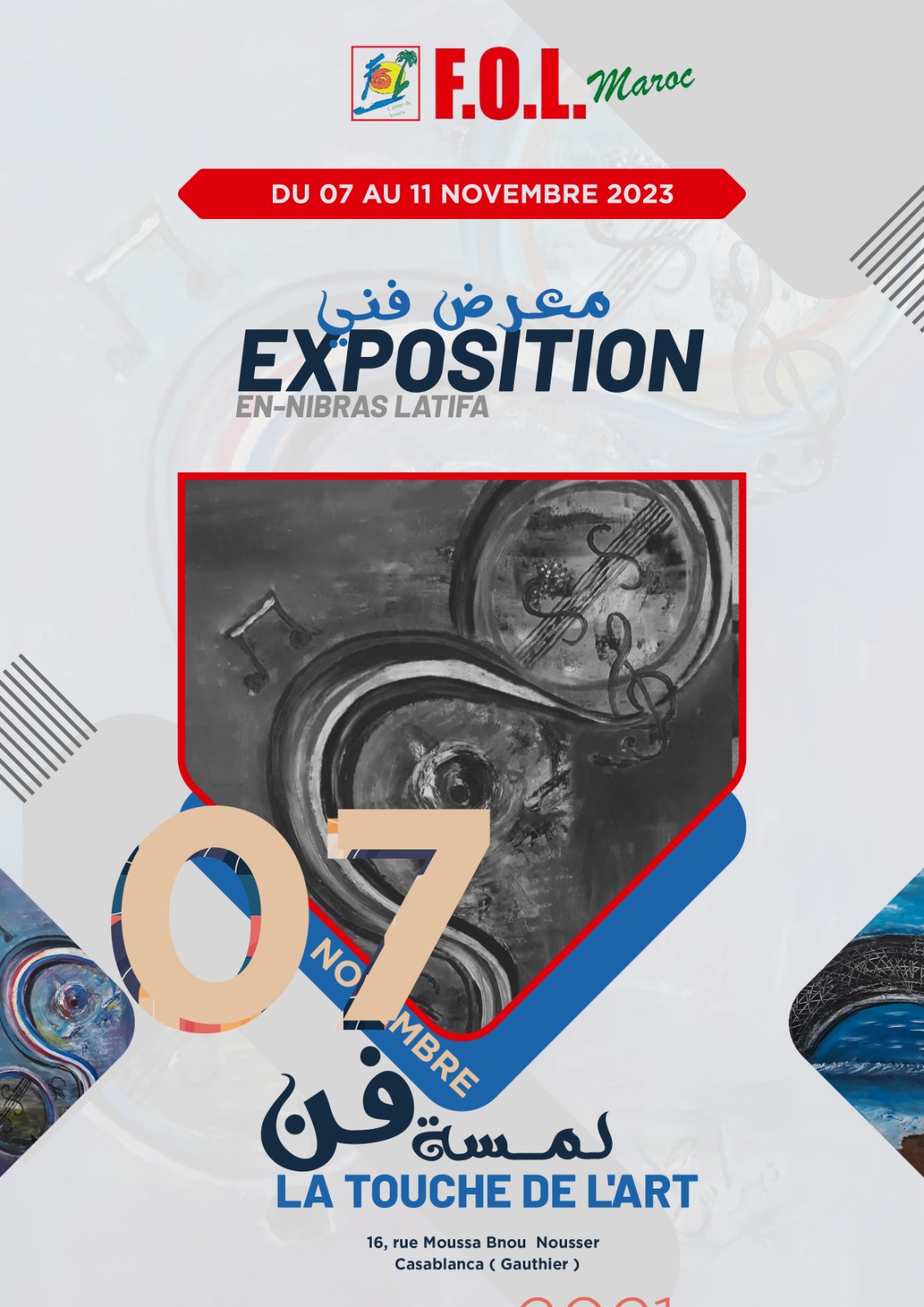 تستعد الفنانة التشكيلية لطيفة النبراس لمعرضها الفني “لمسة فن” برواق ”F.O.L” بالدار البيضاء، وذلك في الفترة من 7 إلى 11 نونبر 2023، حيث تقدم عددا من أعمالها الفنية المميزة والجديدة.