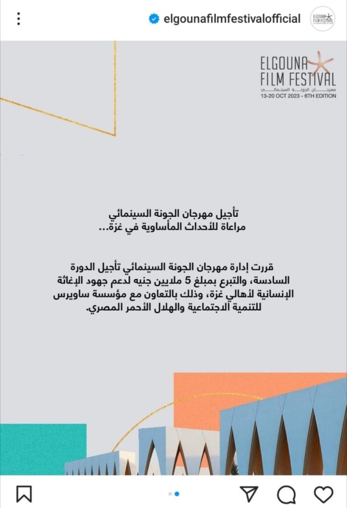 قررت إدارة مهرجان “الجونة” السينمائي بمصر تأجيل الدورة السادسة ، والتبرع بمبلغ 5 ملايين جنيه مصري لدعم جهود الإغاثة الإنسانية لأهالي غزة ، وذلك بالتعاون مع مؤسسة “ساويرس” للتنمية الاجتماعية والهلال الأحمر المصري.