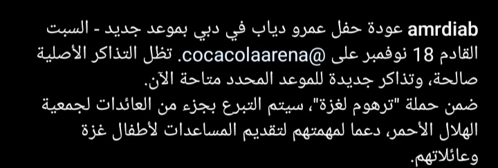 حيث نشر إعلان الحفل وأوضح أن التذاكر الأصلية التي تم طرحها سابقا لا تزال سارية ، وسيتم طرح تذاكر جديدة للراغبين في شرائها ، وكشف عمرو دياب عن الموعد الجديد لحفله في دبي وهو 18 نوفمبر ، الذي تم تأجليه بسبب أحداث غزة .