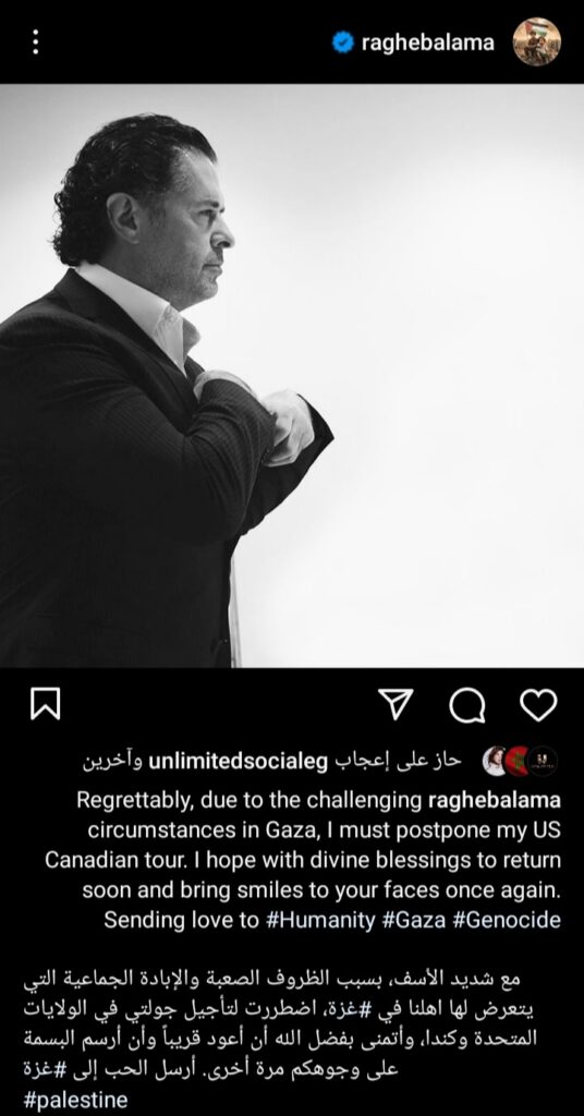 وكتب راغب عبر موقع تبادل الصور والفيديوهات الشهير”إنستجرام” قائلآ: “مع شديد الأسف، بسبب الظروف الصعبة والإبادة الجماعية التي يتعرض لها أهلنا في غزة، إضطررت لتأجيل جولتي في الولايات المتحدة وكندا، وأتمني بفضل الله أن أعود قريبآ وأرسم البسمة علي وجوهكم مرة أخري، أرسل حبي إلي “.