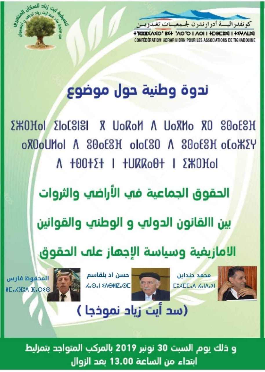 تعتزم كنفدرالية ادرار ندرن بتنسيق مع تنسيقية ايت زياد؛ تنظيم ندوة وطنية حول موضوع: ” الحقوق الجماعية في الأراضي والثروات بين االقانون الدولي والوطني والقوانين الامازيغية وسياسة الإجهاز على الحقوق ”، وذلك يوم 30 نونبر 2019،