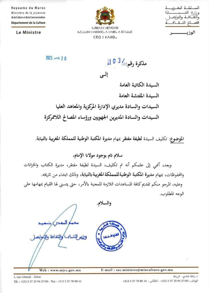 ووفق هذا القرار الذي توصل به المدير العام للوزارة ومديري الإدارة المركزية والمعاهد العليا والمديرين الجهويين التابعين للوزارة، دون أن يتوصل به مدير المكتبة أو إدارتها، فقد تم تكليف لطيفة مفتقر، مديرة الكتاب والخزانات والمحفوظات، بمهام مديرة المكتبة الوطنية للمملكة المغربية بالنيابة، ابتداء من يومه الأربعاء 20 دجنبر الجاري.