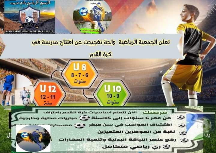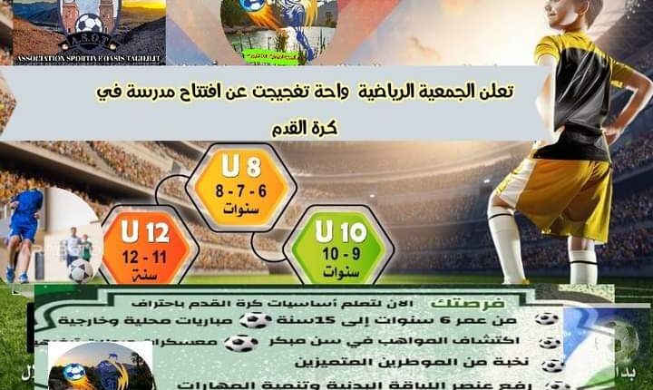 في بادرة طيبة من شباب المنطقة بواحة تغجيجت؛ تم الإعلان عن فتح أبواب التسجيل للراغبين في ممارسة كرة القدام من صنف U8 U10 U12 ودلك لاكتشاف المواهب الشابة بالواحة.