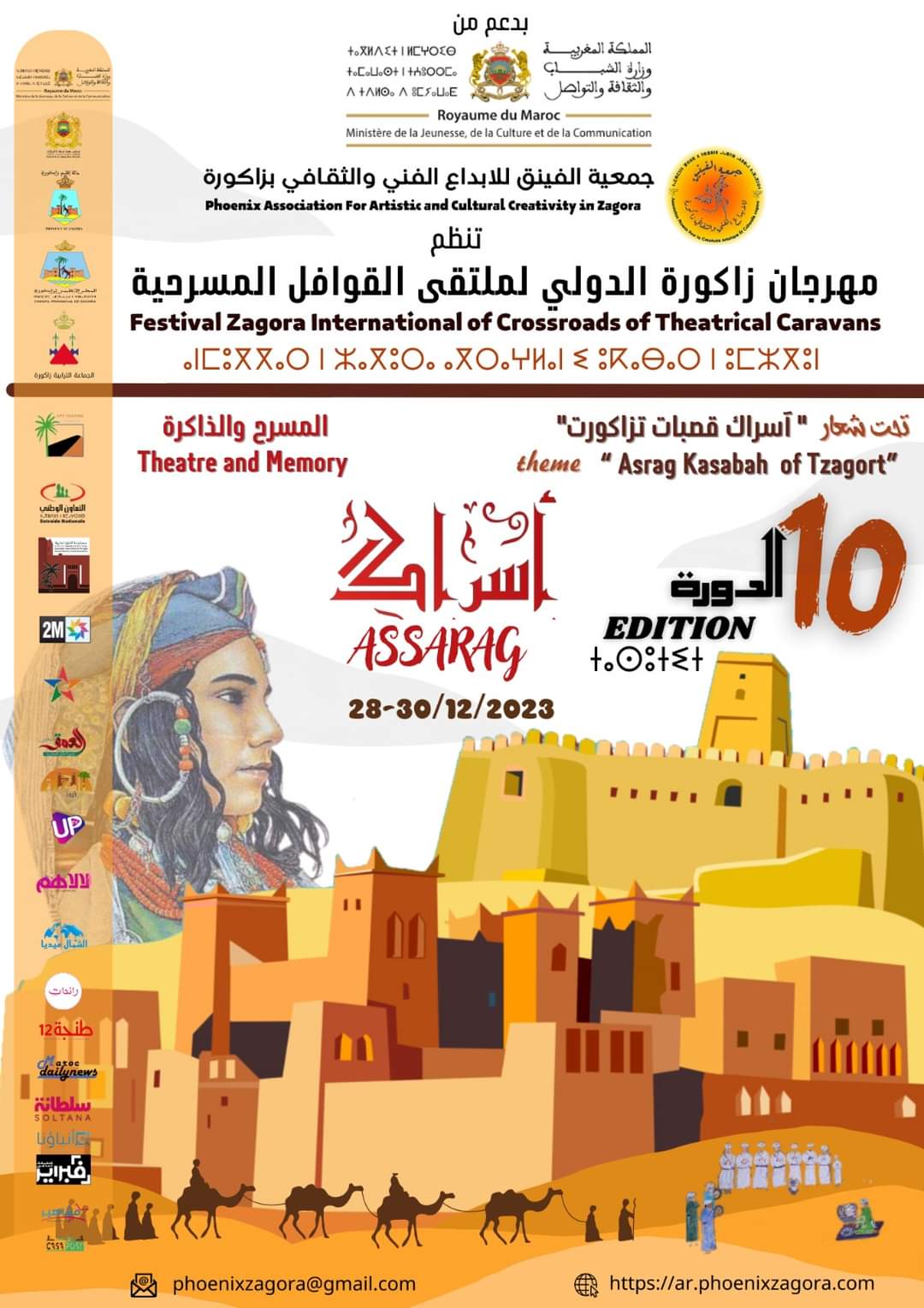 في بــــــلاغ لها توصل موقع دنا بريس بنسخة منه، تعلن جمعية الفينيق للإبداع الفني والثقافي بمدينة زاكورة بالمملكة المغربية، عن تنظيم مهرجان زاكورة الدولي لملتقى القوافل المسرحية آسراك في نسخته العاشرة، من 28 إلى 31 دجنبر 2023.