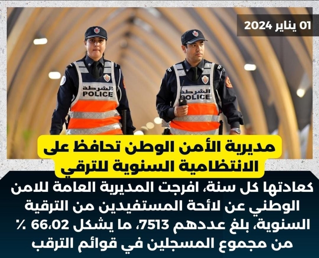 تعلن المديرية العامة للأمن الوطني أن عدد موظفات وموظفي الشرطة الذين استفادوا من الترقية برسم السنة المالية 2023، بلغ مجموعهم 7513 مستفيدا، من بينهم 280 من العنصر النسوي.