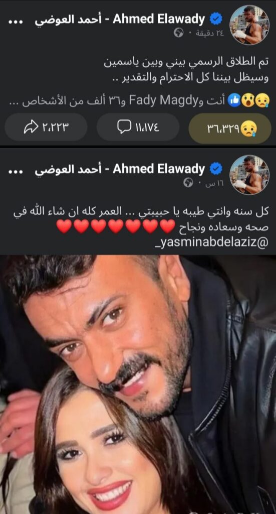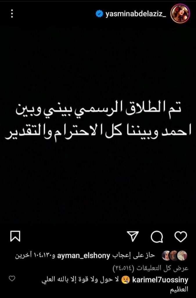 وبعدها بقليل أعلن الفنان أحمد عن طلاقه ياسمين عبد العزيز عبر حسابه الرسمي بموقع التواصل الإجتماعي “فيسبوك” حيث كتب: “تم الطلاق بيني وبين ياسمين سيظل بيننا كل الإحترام والتقدير”.