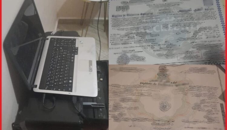 وقد جرى توقيف المشتبه فيهما متلبسين بتزوير دبلومات أكاديمية وشهادات دراسية بغرض استعمالها بشكل غير قانوني، حيث أسفرت عملية الضبط والتفتيش المنجزة عن العثور بحوزتهما على 94 دبلوما وشهادة دراسية وبيانات للنقط مزورة، علاوة على حجز وثائق إدارية أخرى مزيفة، وحاسوبين محمولين وجهاز للطباعة تستخدم في تسهيل ارتكاب هذه الأفعال الإجرامية.