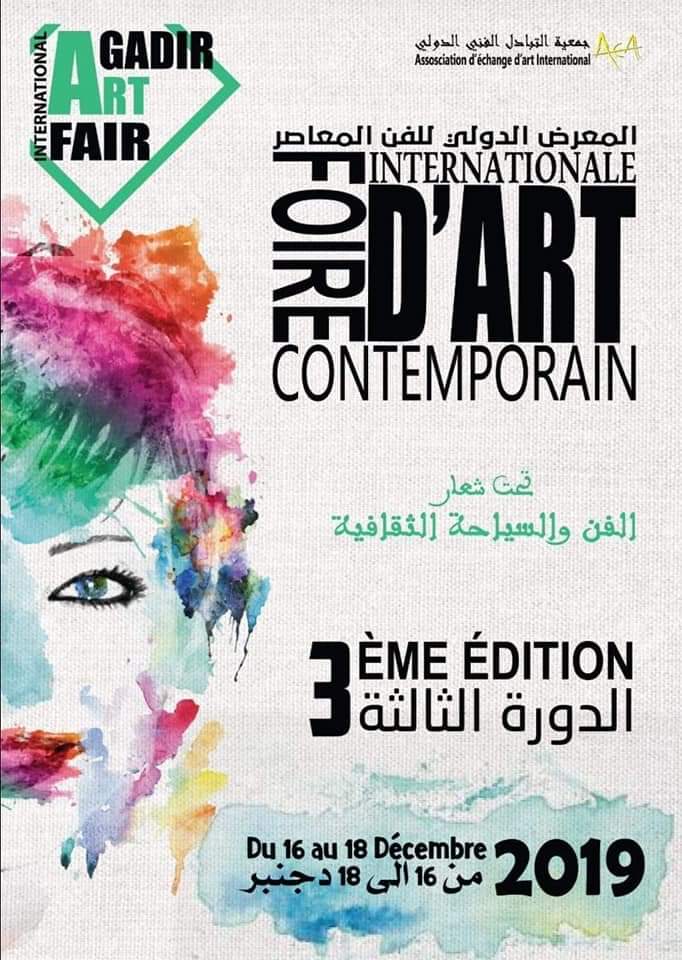 يَعود المعرض الدولي للفن المعاصر (أكادير أرت فير) في دورته الثالثة هذه السنة تحت شعار “الفن والسياحة الثقافية” وذلكَ من 16 إلى 18 دجنبر 2019، حدثٌ ستحتضنُ فعالياتِه غرفة التجارة والخدمات بمدينة أكادير، وسيُشكل مناسبة للجمهور للتعرف على مزيجٍ من الفنون على رأسها الفن التشكيلي والنحت والتصوير والجرافيك وفن الخط العربي وفن النحت على الرمال وفن الفيديو والأعمال المركبة والمجسمات والرسم بالرمال وذلك بحضور فنانين من مختلف دول العالم.