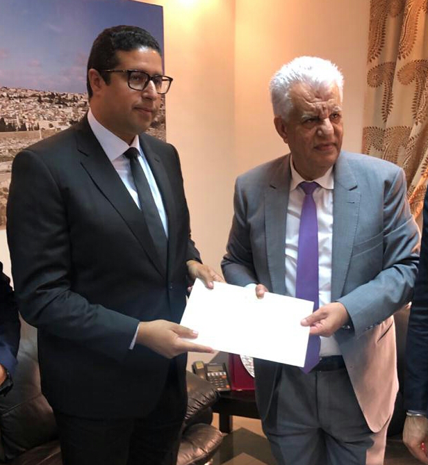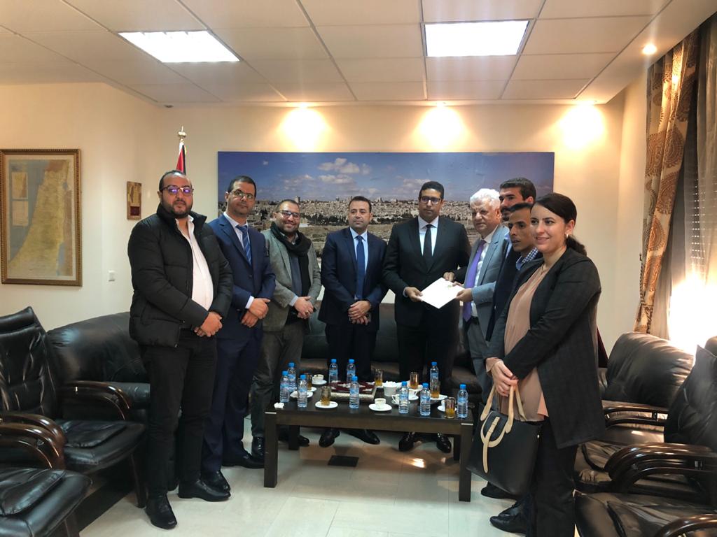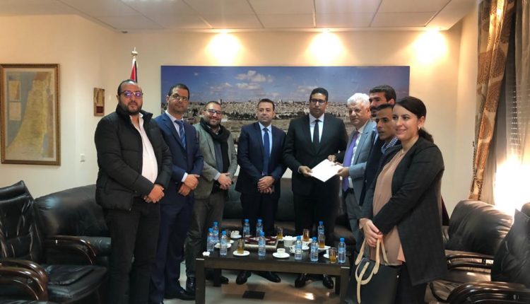 سلم الكاتب العام للشبيبة الاستقلالية عثمان الطرمونية مرفوقا بأعضاء المكتب التنفيذي، معالي سفير دولة فلسطين السيد “الشوبكي جمال”، رسالة تضامن ومؤازرة للقضية الفلسطينية وللشعب الفلسطيني المقاوم، وذلك صباح اليوم، الإثنين 09 من دجنبر 2019، بمقر السفارة الفلسطينية بالرباط، والتي تبعثها مكونات الشبيبة الاستقلالية قيادة وقواعد إلى الرئيس الفلسطيني تعبيرا منها على كل قيم الإخاء والمودة المشتركة التي تجمع البلدين قيادة وشعبا، فجلالة الملك محمد السادس نصره الله وأيده ومعه كل مكونات الشعب المغربي حسب نص الرسالة ما فتأت في التأكيد على حرصها الدائم على دعم صمود ونضال ومقاومة الشعب الفلسطيني بالقيادة النيرة لفخامة الرئيس محمود عباس ابو مازن، فجلالته بصفته رئيس لجنة القدس التي تقدم جهود كبيرة لصمود المقدسيين في وجه الطغيان الصهوني الجائر يعمل دئما وأبدا على دعم القضية والبحث عن سبل الحل العادل والشامل والذي ينصف الشعب الفلسطيني المقاوم.