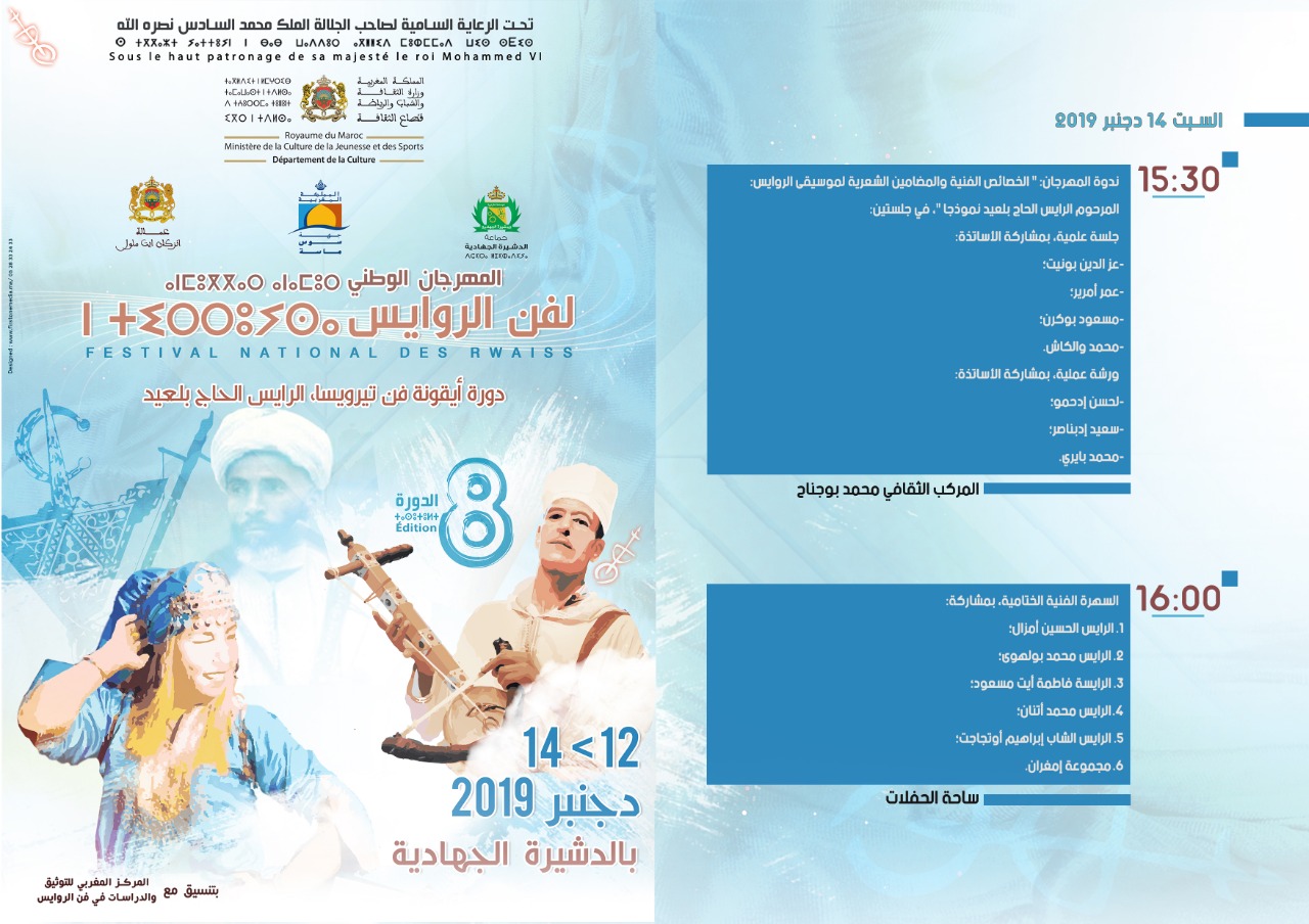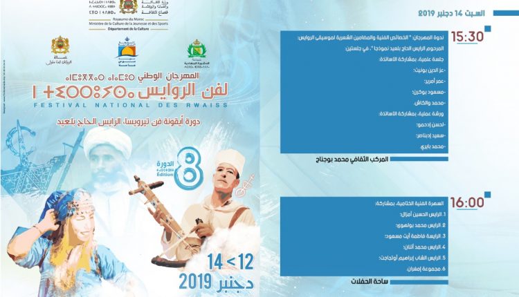 سيلتقي جمهور مدينة الدشيرة الجهادية وجهة سوس ماسة وفعالياتهما الثقافية والفنية مع الدورة الثامنة للمهرجان الوطني لفن الروايس، الذي تنظمه وزارة الثقافة والشباب والرياضة – قطاع الثقافة، بتعاون مع جماعة الدشيرة الجهادية ومجلس جهة سوس ماسة وبتنسيق مع عمالة إنزكان أيت ملول، وذلك من 12 الى 14 دجنبر 2019 بمدينة الدشيرة الجهادية. وتأتي هذه التظاهرة الفنية الثقافية في إطار سلسلة المهرجانات التراثية التي ترعاها وزارة الثقافة والشباب والرياضة- قطاع الثقافة، في مجال الفنون على الصعيد الوطني