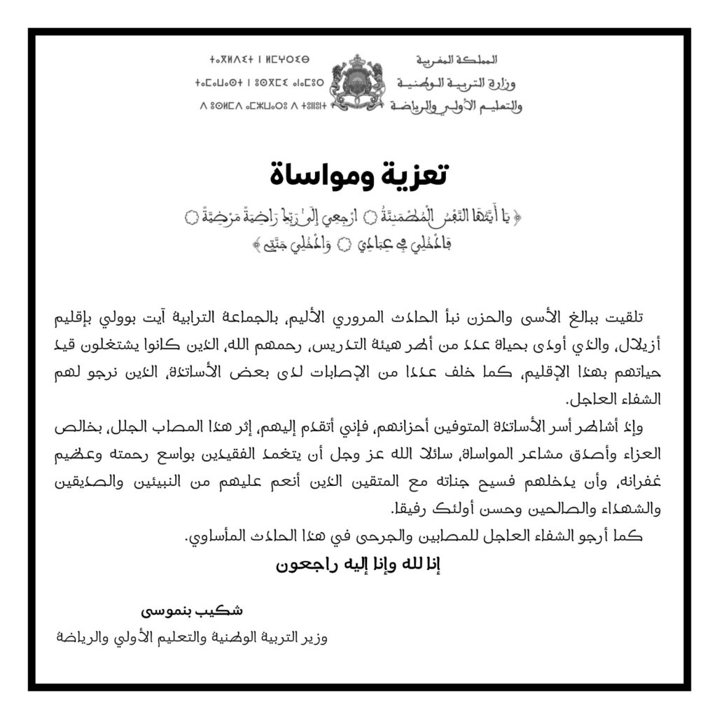 ورداً على هذا الحادث الأليم، أعرب السيد شكيب بنموسى، وزير التربية الوطنية والتعليم الأولي والرياضة، في بلاغ تحصل موقع دنا بريس على نسخة منه، (أعرب ) عن بالغ التعازي لأسر الضحايا وتمنياته بالشفاء العاجل للمصابين. كما أكد على ضرورة اتخاذ إجراءات لتحسين سلامة الطرق وتعزيز التوعية المرورية للحد من حوادث المرور في المنطقة.