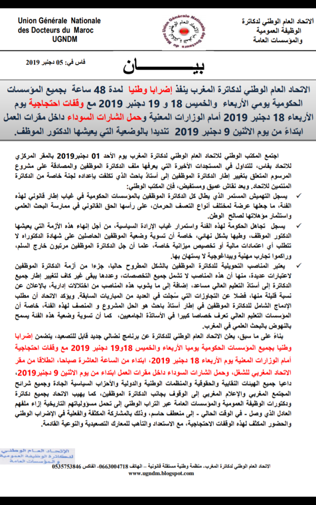 بناءً على ما سبق، يعلن الاتحاد العام الوطني للدكاترة عن برنامج نضالي جديد قابل للتصعيد، يتضمن إضرابا وطنيا بجميع المؤسسات الحكومية يوميا الأربعاء والخميس 18و19 دجنبر 2019 مع وقفات احتجاجية أمام الوزارات المعنية يوم الأربعاء 18 دجنبر 2019، ابتداء من الساعة العاشرة صباحا، انطلاقا من مقر الاتحاد المغربي للشغل، وحمل الشارات السوداء داخل مقرات العمل ابتداء من يوم الاثنين 9 دجنبر2019، داعيا جميع الهيئات النقابية والحقوقية والمنظمات الوطنية والدولية والأحزاب السياسية الجادة وجميع شرائح المجتمع المغربي والإعلام المغربي إلى الوقوف بجانب الدكاترة الموظفين، كما يهيب الاتحاد بجميع دكاترة ودكتورات الوظيفة العمومية والمؤسسات العامة عبر التراب الوطني إلى تحمل مسؤولياتهم التاريخية إزاء ملفهم العادل الذي وصل – في الوقت الحالي – إلى منعطف حاسم، وذلك بالمشاركة المكثفة والفعلية في الإضراب الوطني والحضور المكثف لهذه الوقفات الاحتجاجية، مع الاستعداد والتأهب للمعارك التصعيدية والنوعية القادمة.
