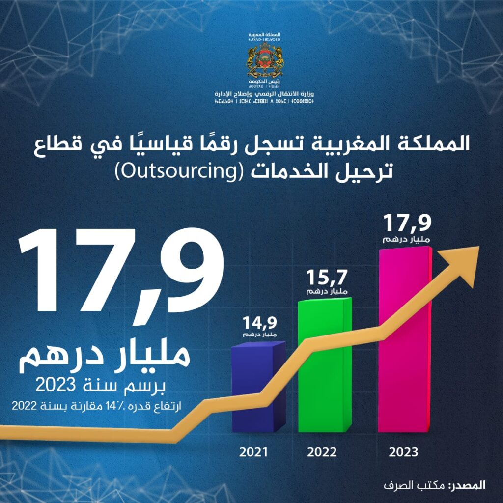أعلنت غيثة مزور، وزيرة الانتقال الرقمي وإصلاح الإدارة، عن تسجيل المملكة المغربية لرقم قياسي جديد وغير مسبوق في قطاع ترحيل الخدمات ‘Outsourcing’، ببلوغ حجم صادرات القطاع ما يقارب 18 مليار درهم برسم سنة 2023، بارتفاعٍ نسبته %14 مقارنة بسنة 2022، وذلك وفق آخر الأرقام الصادرة عن مكتب الصرف. مذكرة بأن هذه الأرقام إنجازٌ جديدٌ ينضافُ إلى تموقعُ المملكة في المرتبة الثانية إفريقياً في قطاع ترحيل الخدمات.