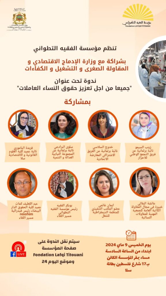 تساهم د.إيمان غانمي، عضوة المكتب التنفيذي للمنظمة الديمقراطية للشغل ورئيسة المنظمة الديمقراطية للصحافة والإعلام والاتصال، إلى جانب نخبة من النساء الفاعلات في المجال النقابي والسياسي والخبيرات في المجال القانوني والمقاولاتي، في الندوة الوطنية التي تنظمها مؤسسة الفقيه التطواني. بشراكة مع وزارة الإدماج الإقتصادي والمقاولة الصغرى والتشغيل والكفاءات، تحت عنوان “جميعا من أجل تعزيز حقوق النساء العاملات ”، وذلك مساء الخميس 9 ماي الجاري بسلا.