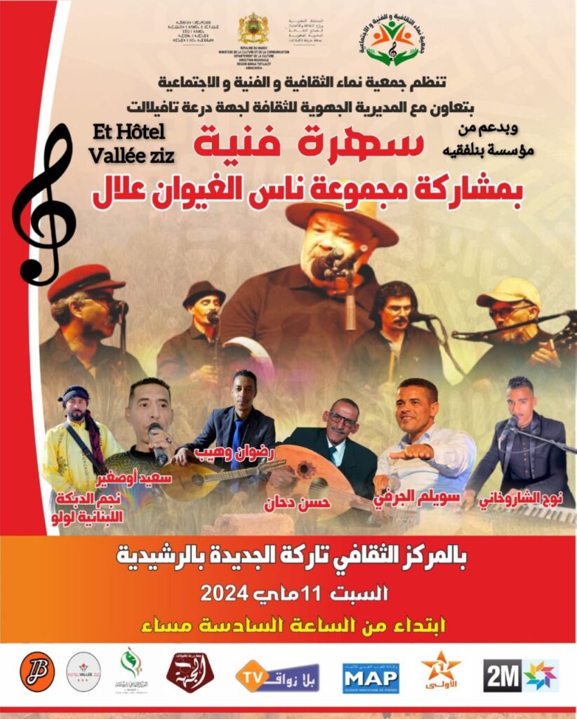 بتعاون مع المديرية الجهوية للثقافة والشباب والتواصل، بجهة درعة تافيلالت، وبدعم من مؤسسة بنلفقيه وفندق (Vallée ziz) تنظم جمعية نماء الثقافية والفنية والاجتماعية، حفلا فنيا كبيرا، تحييه المجموعة الغنائية “ناس الغيوان علال” التي سبق وأحيت العديد من السهرات داخل وخارج أرض الوطن. وهي مكونة من المايسترو الغيواني علال يعلا، ثم الفنان المهووس والمسكون بالظاهرة الغيوانية رضوان عاريف، الذي كان عضوا لسنوات بمجموعة ناس الغيوان، قادما إليها من “إعشاقن” ومجموعات غنائية أخرى. يرافقهما بالعزف والغناء ضمن المجموعة ذاتها، كل من : عبد الرحيم شيهاب، مصطفى شيهاب ثم عبد الرحمان الزوبيحي ورشيد المسعودي.