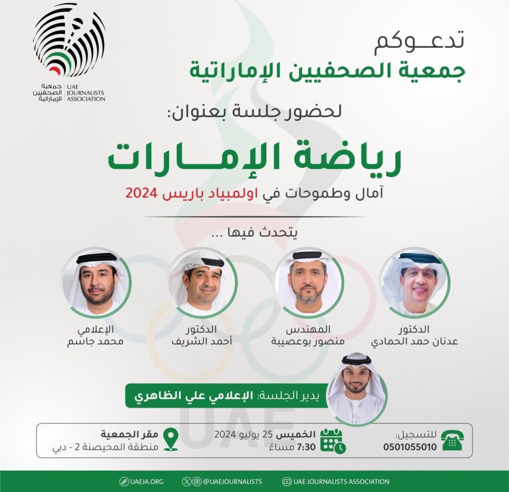 دبي- وجهت جمعية الصحفيين بدولة الامارات العربية دعوة رسميه لاعضائها لحضور جلسة رياضية بعنوان “رياضة الإمارات .. آمال وطموحات في اولمبياد باريس 2024”.