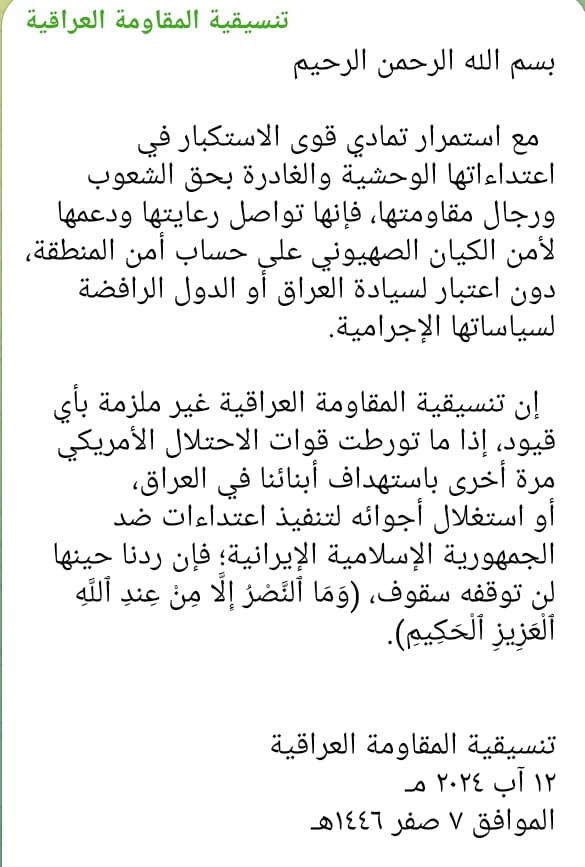 نشرت تنسيقية المقاومة العراقية بياناً توعدت فيه القوات الأمريكية في العراق، وحذرتها من استمرار استهداف قادة المقاومة في العراق الذين ينفذون هجمات ضد إسرائيل حسب وصف البيان.