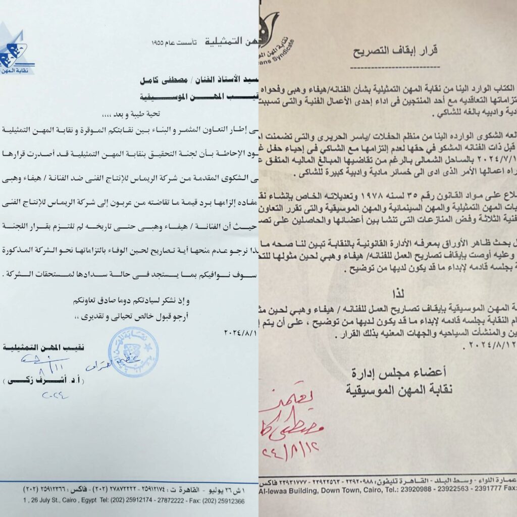 وجاء هذا الإجراء بعد أن وجه الدكتور أشرف ذكي، نقيب المهن التمثيلية، خطاباً -تحصل موقع دنا بريس على نسخة منه- إلى الفنان مصطفى كامل، نقيب المهن الموسيقية، بصفتهما وكيلي اتحاد النقابات الفنية، طالباً تفعيل دور الاتحاد والتعاون اللازم لحل القضية.