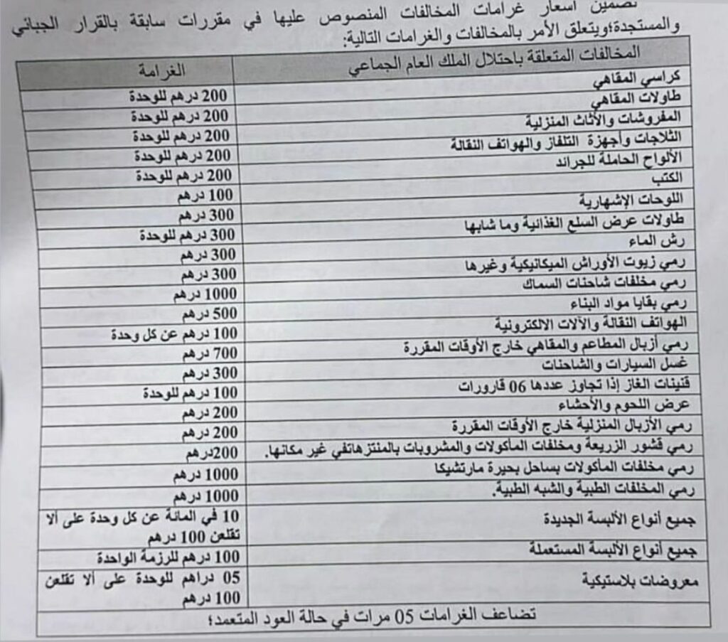 وحدد المجلس الجماعي الغرامات اليومية في 200 درهم، على كل كرسي أو طاولة أو مفرشضات أو ثلاجات وأجهزة إلكترونية وجرائد، تم عرضها على الرصيف أو في الأماكن العمومية دون الحصول على ترخيص مسبق من الإدارة المعنية، و300 درهم عن رش الماء أو رمي زيوت الأوراش المكيانيكية.