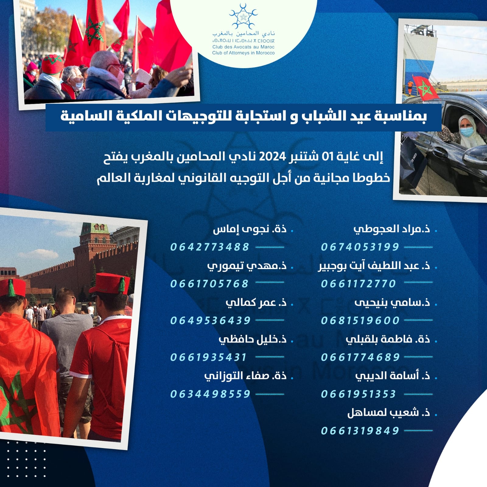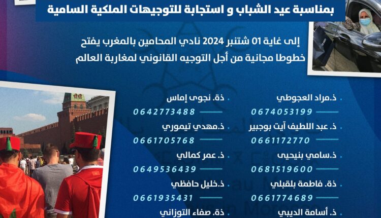 وخصص نادي المحامين بالمغرب في هاته الدورة 10 أرقام هاتفية، سيقوم من خلالها أعضاء النادي بتقديم توجيهات قانونية لمغاربة العالم، وذلك حتى تاريخ الأول من شتنبر المقبل.